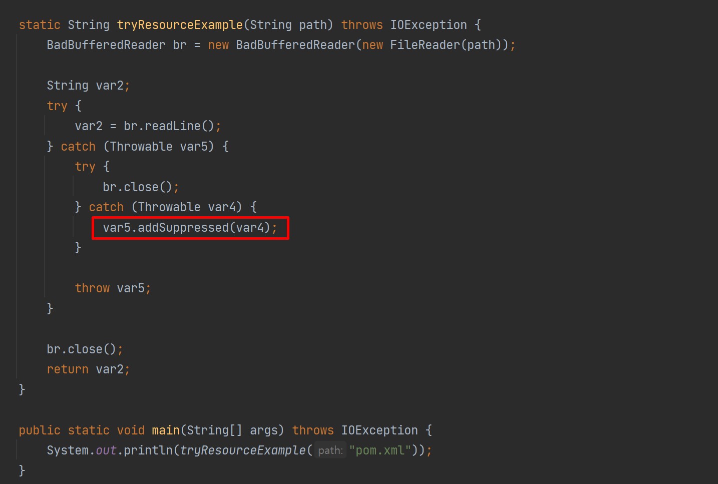 어떻게 stack 에 두개의 두 exception 로그를 남길 수 있는지 try-with-resource (바이트 코드에서 디컴파일된 클래스 파일)로 확인할 수 있다.