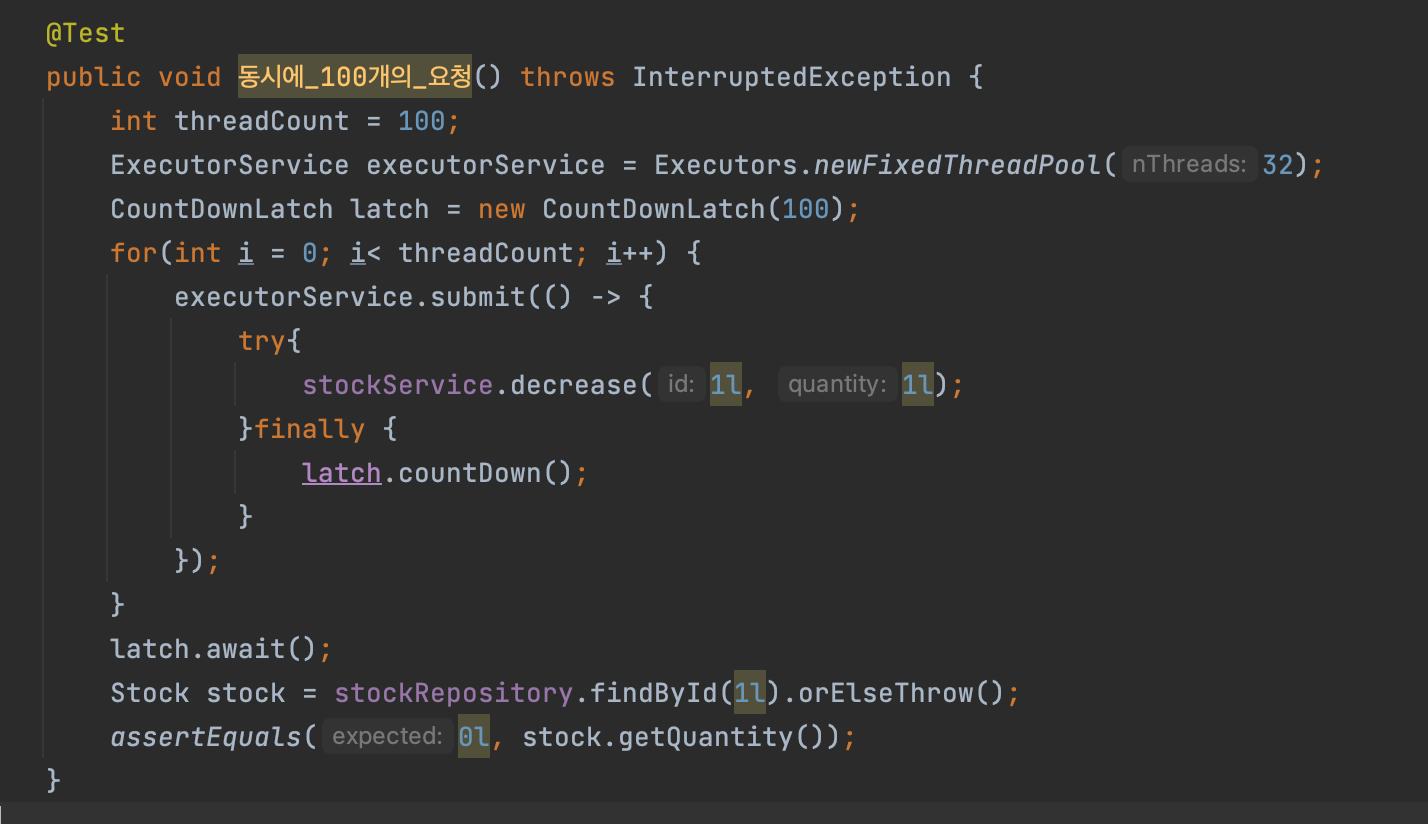아래와 같이 멀티 스레드 환경에서 여러 요청이 들어올때 ( 위 DAO 는 아래의 decrease 서비스 로직 안에 포함되어 있다.)
