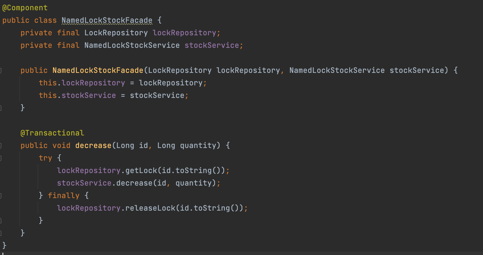 - 이것은 Pessimistic 락과 유사한데 Pessimistic Lock 은 row 나 테이블 단위로 걸지만 namedLock 은 메타데이터 Lock 을 하는 것이다.