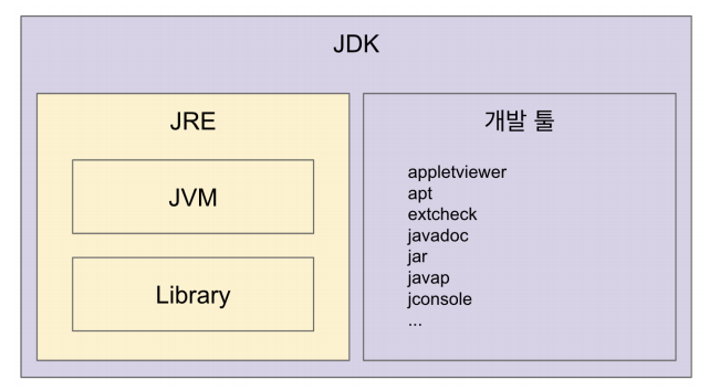 - JDK : (Java Development Kit) : JRE + 개발에 필요한 툴, JAVA 11이후에는 JDK만 제공되어 JRE를 따로 제공하지 않습니다.