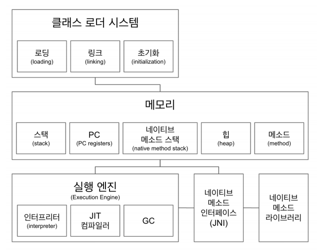 - 자바 가상 머신으로 자바 바이트 코드(.class 파일)을 OS 에 특화된 코드로 변환(인터프리터와 JIT컴파일러) 하여 실행합니다.