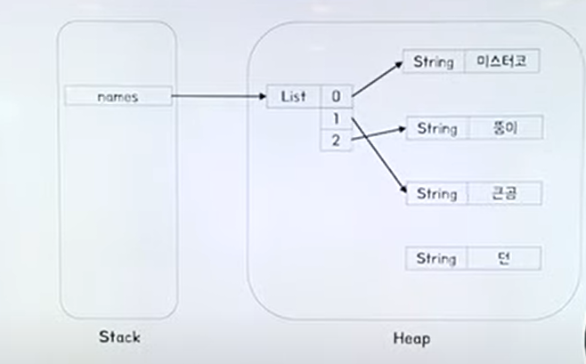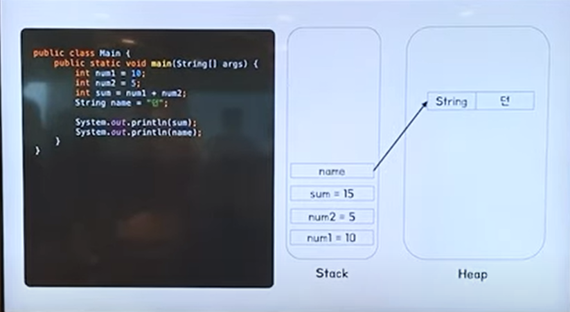 * Heap : 동적으로 할당된 메모리 영역, 모든 Object 타입의 데이터가 할당, Heap 영역의 Object 를 가리키는 참조 변수가 Stack 에 할당됩니다.