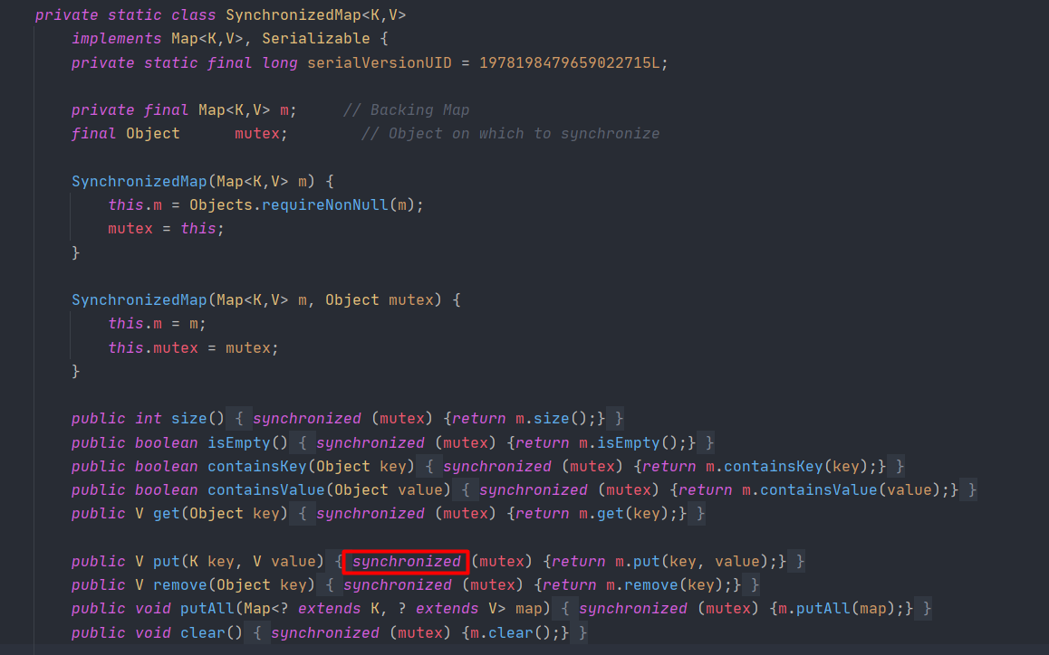 - SyncronizedMap 의 경우 put 메서드 자체에 synchronized 키워드가 존재한다.