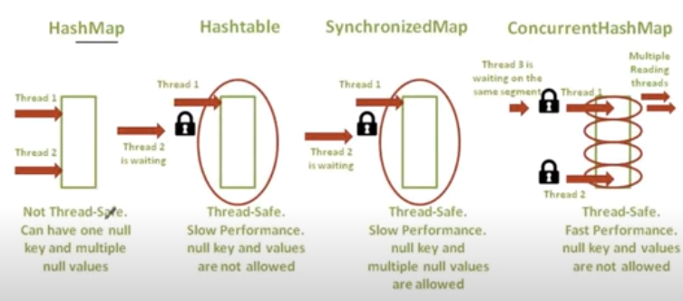 - HashTable (Legacy Class in Java) : 동기화된 구조, 즉 잠금을 제공한다. 스레드 1이 접근하고 실행이 종료되면 스레드 2가 값을 가져와 실행될 수 있다. 스레드가 안전하지만 대기 현상으로 느린 성능을 가질 수 있다.